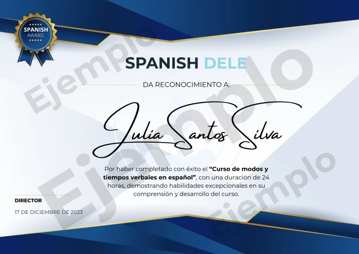 Após a conclusão do curso, você receberá esse certificado, que não só demonstrará um sólido domínio da gramática espanhola, mas também lhe dará a confiança necessária para se expressar com precisão em qualquer situação.